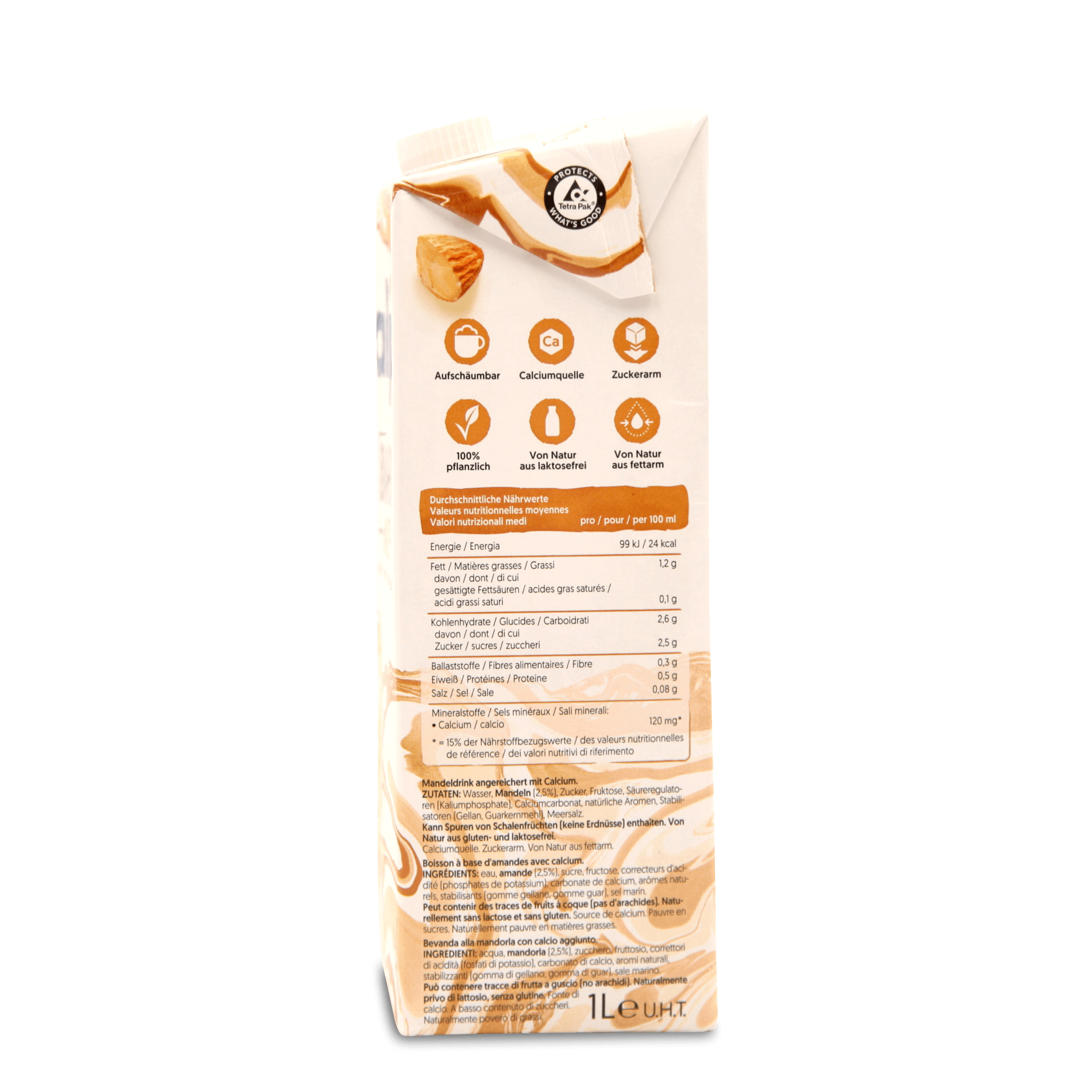Wasser, MANDELN (2,5%), Zucker, Fruktose, Säureregulatoren: Kaliumphosphate; Calciumcarbonat, natürliche Aromen, Stabilisatoren: Gellan, Guarkernmehl; Meersalz. Kann Spuren von Schalenfrüchten (keine Erdnüsse) enthalten. Von Natur aus gluten- und laktosefrei.