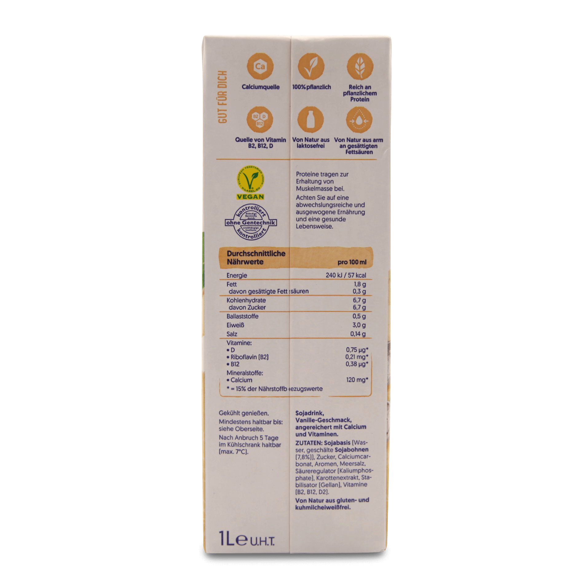 Wasser, Zucker, geschälte SOJABOHNEN (5,8%), Calciumcarbonat, Aromen, Meersalz, Säureregulator: Monokaliumphosphat; Karottenextrakt, Stabilisator: Gellan; Vitamine (Riboflavin (B2), B12, D2). Von Natur aus gluten- und kuhmilcheiweißfrei. Von Natur aus laktosefrei.