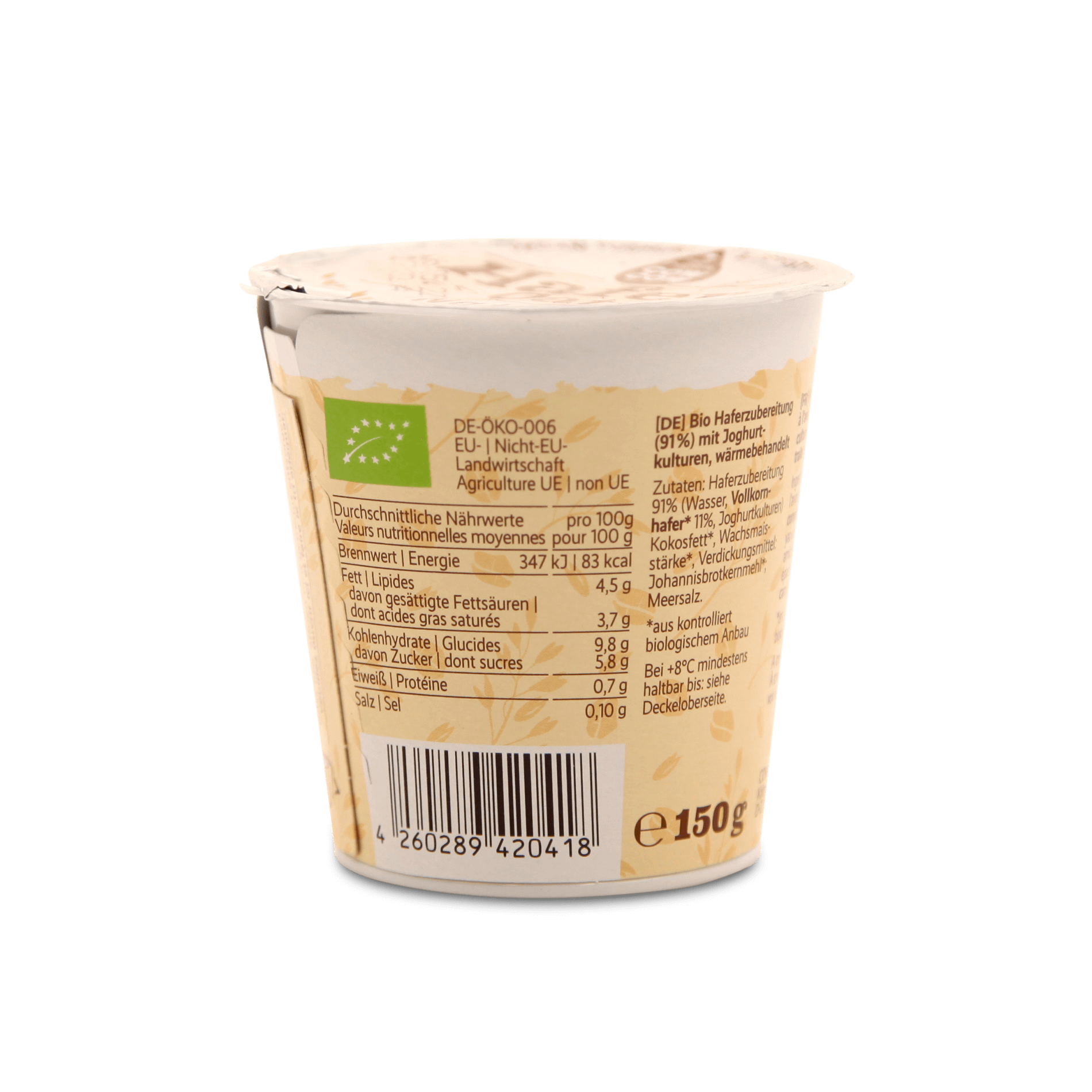 Wasser, HAFERMEHL* 11%, Stärke*, Kokosöl*, Stabilisator: Johannisbrotkernmehl*, Milchsäurekulturen; *Zutaten aus biologischer Landwirtschaft