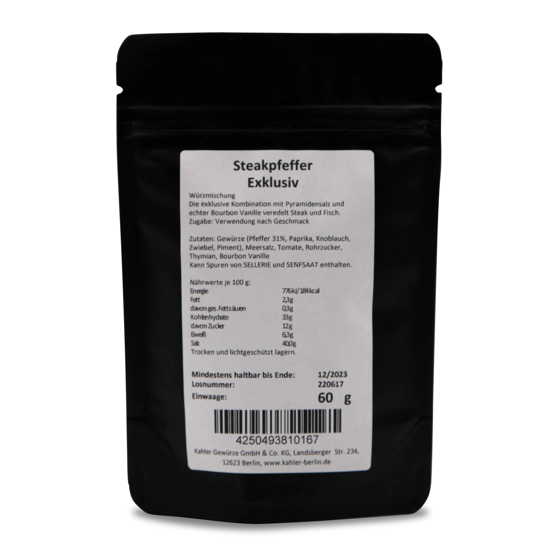 Steakpfeffer ist eine beliebte Gewürzmischung zum Grillen, die Gerichten eine sehr pfeffrige Note verleiht. Steakpfeffer enthält für gewöhnlich eine oder mehrere Pfeffersorten, Salz, Paprika, Zwiebel, Knoblauch und verschiedene Kräuter wie beispielsweise Oregano, Basilikum oder Rosmarin. Dieser Steakpfeffer verdient den Zusatz 'exklusiv': Er enthält zudem auch Bourbon-Vanille, eines der kostbarsten Gewürze der Welt.